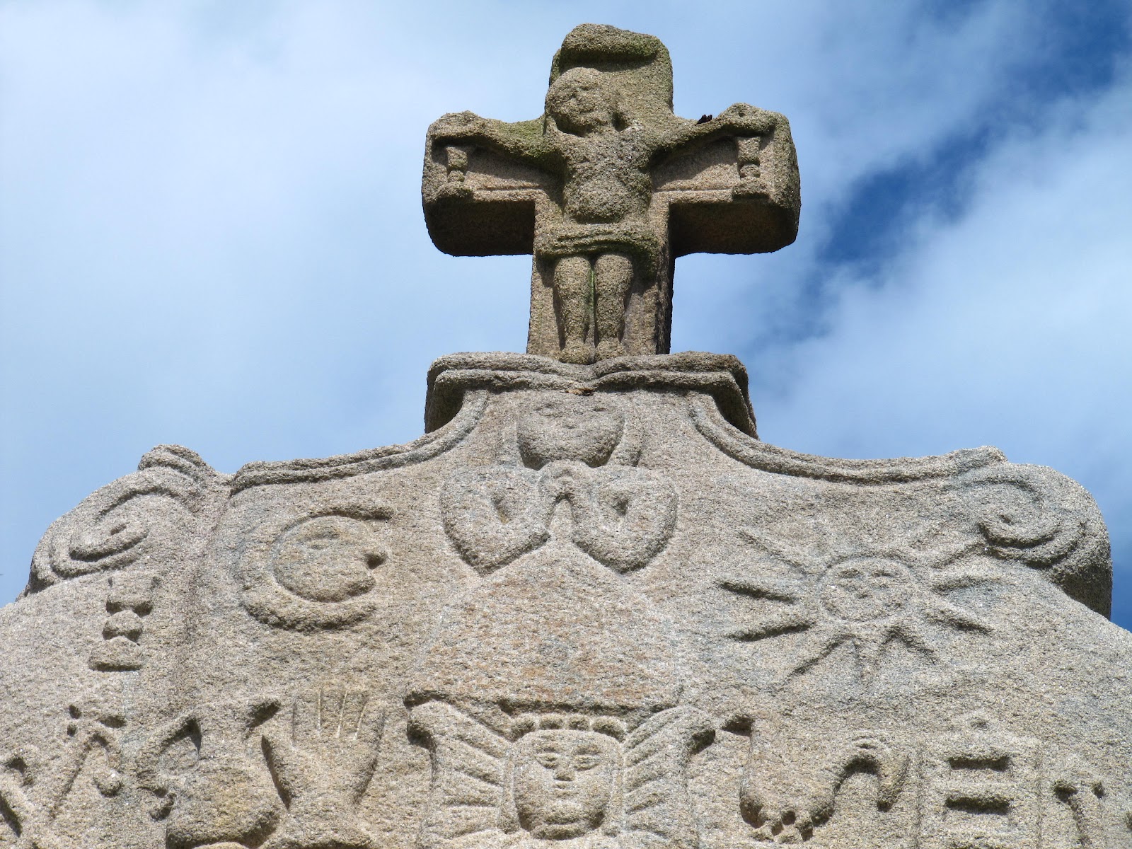 Wir starteten die Tour bei den zwei Dolmen hier im Ort (Kerguntull) und fuhren zum fast 8 m hohen Menhir von St.- Uzec, der im späten 17. Jahrhundert von einem unbekannten Künstler mit Symbolen christianisiert wurde.