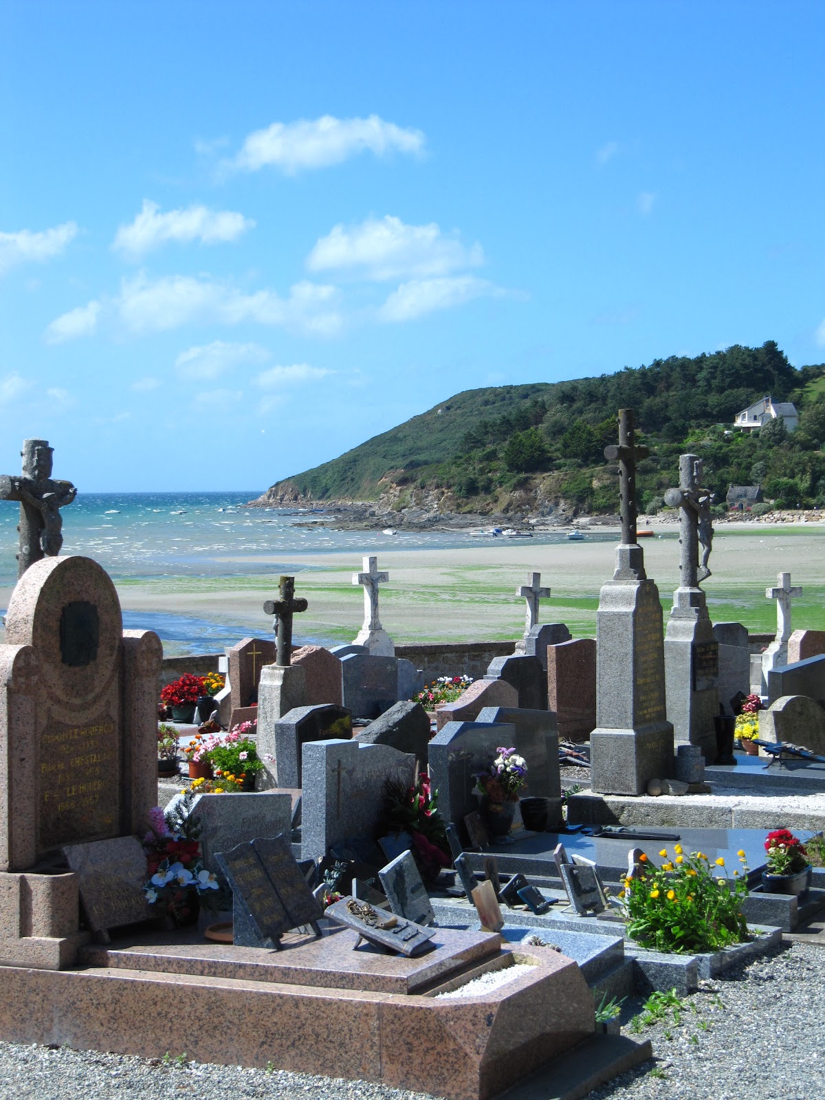 Anschließend fuhren wir über die Corniche nach Lannion, welches uns mit seinem Industriegebiet ziemlich langweilte, so dass wir erst gar nicht in die Stadt hinein fuhren. Der Weg führte uns in das kleine Fischerdorf St-Michel-en-Grève, wo wir uns den Seemannsfriedhof ansahen. Leider war der Sandsturm so heftig, dass uns ziemlich schnell die Augen brannten.
