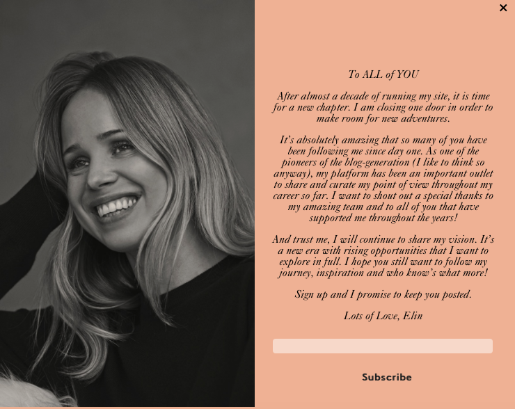Gerade bei Journelles gelesen: Elin Klings Blog geht in Rente. Wem das nichts sagt: Die Schwedin ist Modebloggerin der allerersten Stunde und hat es geschafft, als eine der ersten ein ganzes Imperium daraus zu erschaffen (sie hat zum Beispiel eine eigene H&M- Linie unter ihrem Namen herausgebracht). So möchte sie sich auch in Zukunft lieber ihrer eigenen Modelinie widmen. Ich bin immer ziemlich beeindruckt, wenn ich sehe, was alles aus einem Blog werden kann und träume auch schon von einem Loft in New York…