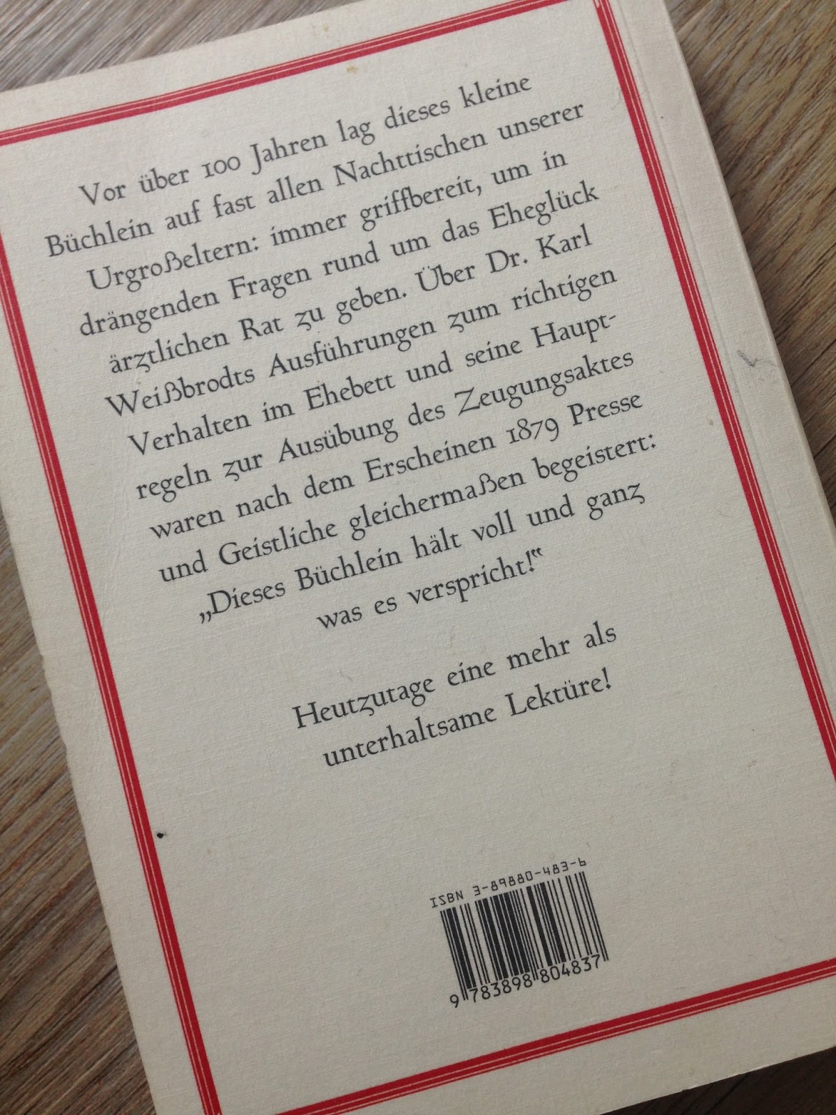 Netterweise hat uns unsere Ferienhausvermieterin etwas „Literatur“ hingelegt. Unter anderem befindet sich das Buch „Die eheliche Pflicht – Ein ärztlicher Führer aus Uromas Zeiten“ von Dr. Karl Weißbrot darunter, im Original angeblich aus dem Jahr 1879.