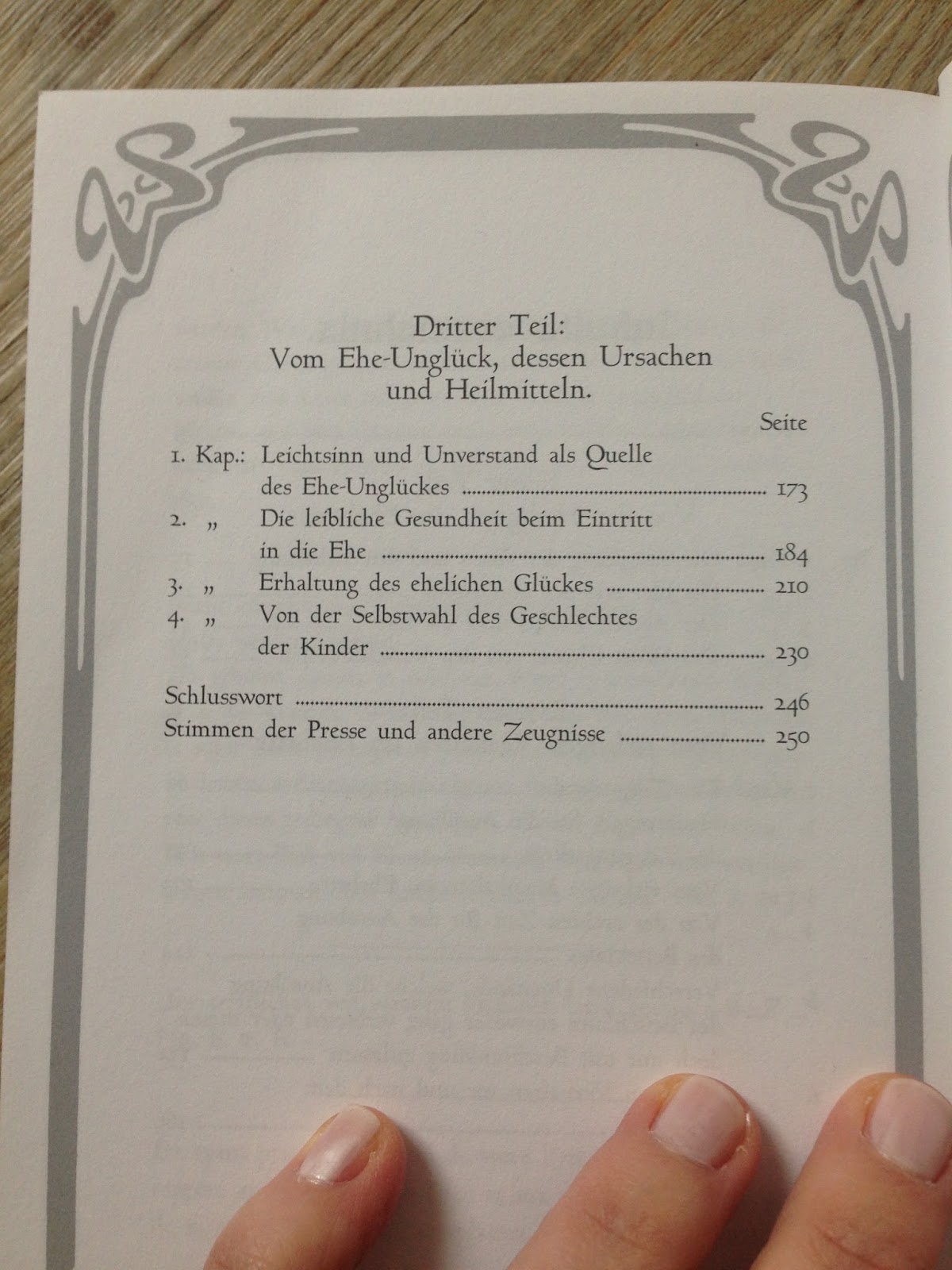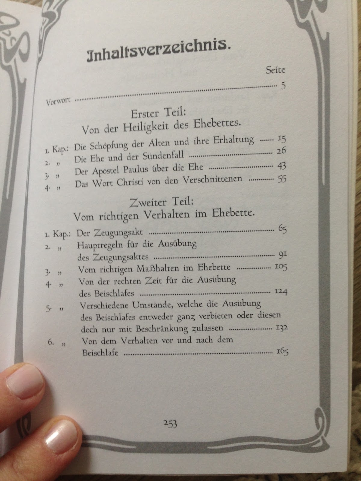„Vom richtigen Maßhalten im Ehebett“ oder „Die leibliche Gesundheit beim Eintritt in die Ehe“, sind nur zwei Kapitel der 254 Seiten. Angeblich „Heutzutage eine mehr als unterhaltsame Lektüre!“