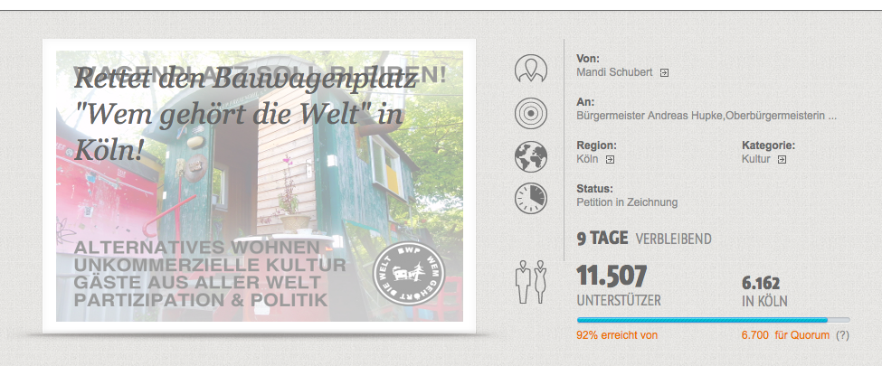 Die Bewohner geben wirklich Gas um ihren Bauwagenplatz zu behalten. Demos, Konzerte, der Blog Wem gehört die Welt? und eben diese Online Petition.
