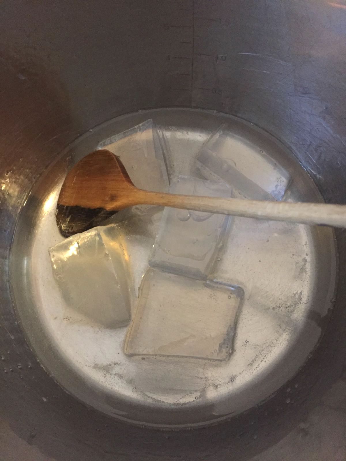 Ihr schneidet kleine Stücke und erwärmt sie im Wasserbad. Das geht relativ schnell, denn die Seife lässt sich sehr gut schneiden: