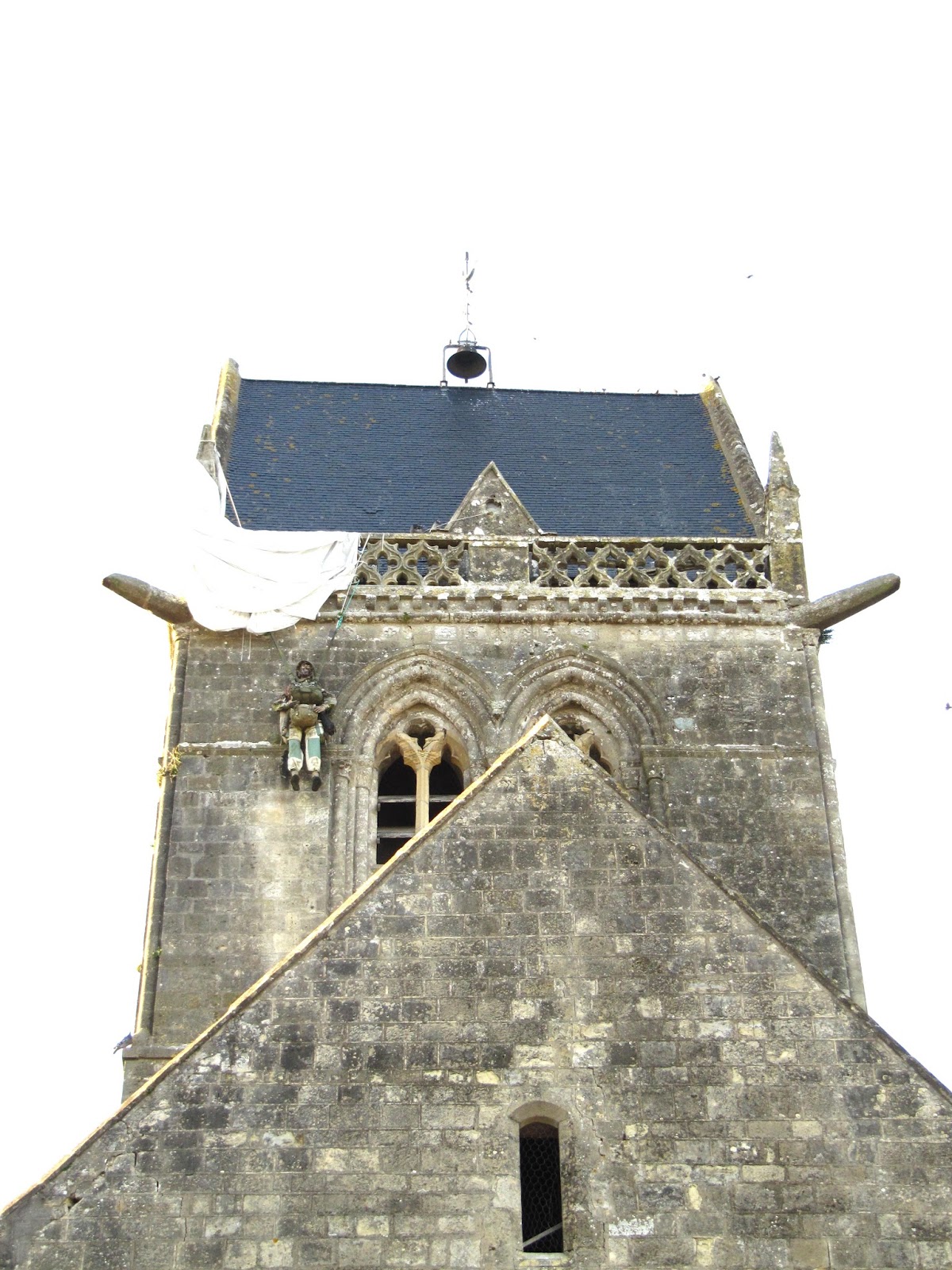 Eine Frankreichreise führte uns in die Normandie nach Sainte- Mère- Eglise. Dort hängt an einem alten Kirchturm eine Puppe des Fallschirmjägers John Steele.