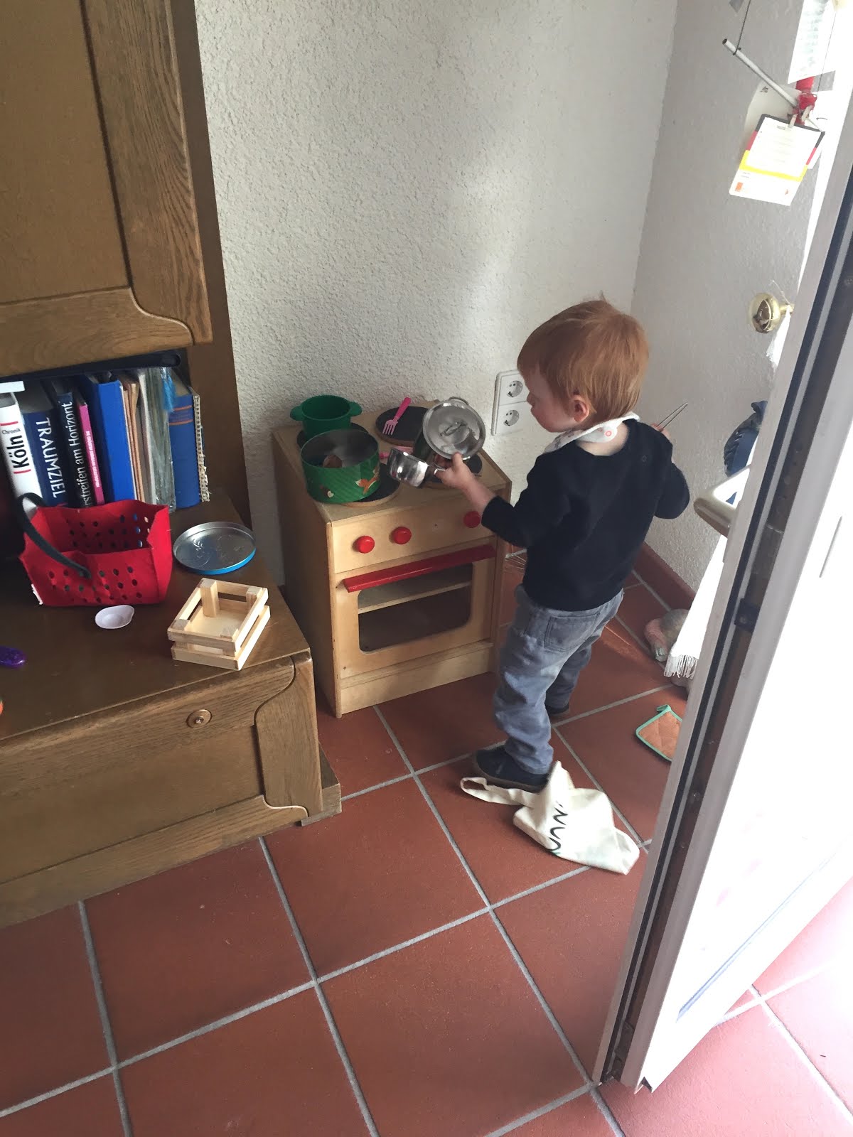 Auch beim späten Frühstück der Schwester (und damit bereits seinem dritten!) mischt das Kind mal wieder ordentlich mit. Zwischendrin wird ordentlich gekocht. Es gibt Würstchen mit Fisch und Apfel.Bei dem Wetter lassen wir die Ente frei, die vor kurzem noch Teil eines Karnevalskostüms war: