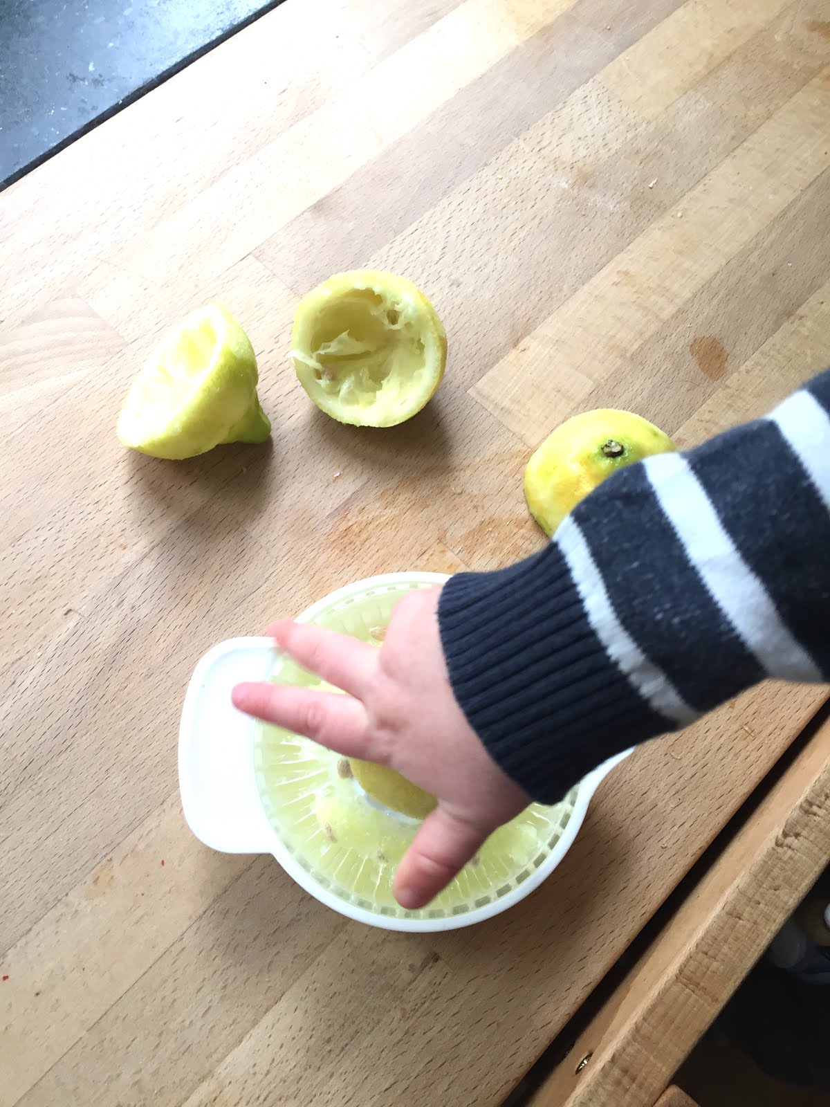 Zuerst reibt ihr die Schale von 3 Zitronen ab und presst zwei der Zitronen aus. Diese Arbeit wird sehr gerne vom Nachwuchs übernommen: