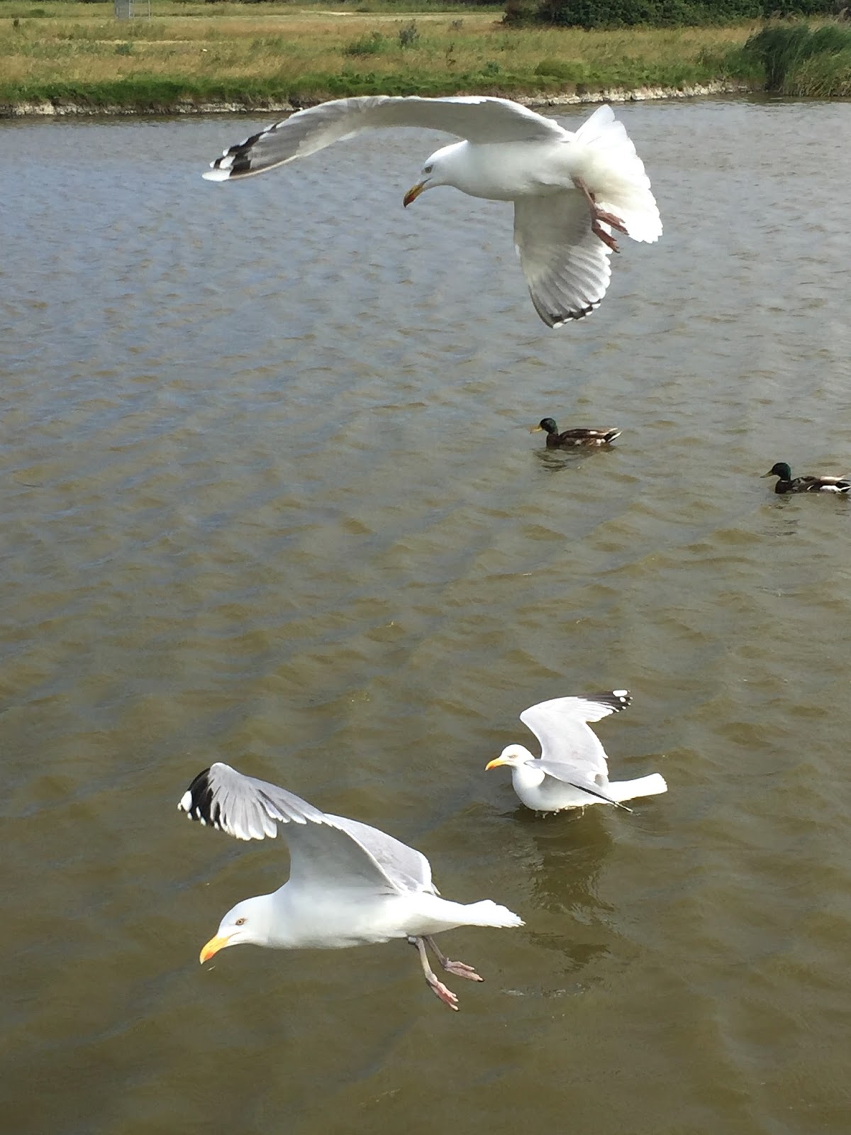 Nach dem Frühstück zieht es uns Urlauber zum nahgelegenen Ententeich, um die miesen nicht so leckeren, holländischen Brötchen zu verfüttern. Allerdings haben die Enten gegen die deutlich gierigeren Möwen kaum eine Chance: