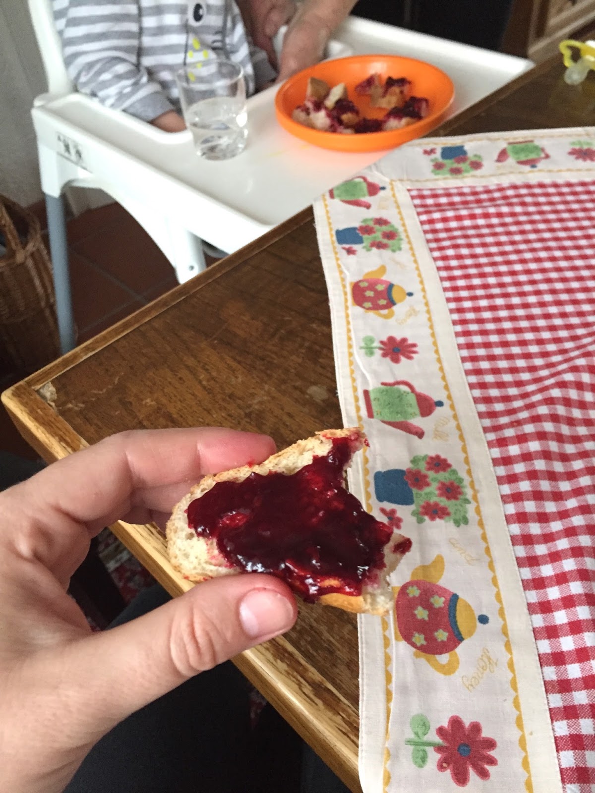 Nachdem ich letzte Nacht geträumt habe, Kylie Minogue wäre bei uns eingezogen und ich müsste sie etwas mästen füttern, beginne ich meinen Tag erstmal hungrig mit einem leckeren Brötchen mit Mamas selbstgemachter Brombeermarmelade. Guten Morgen!