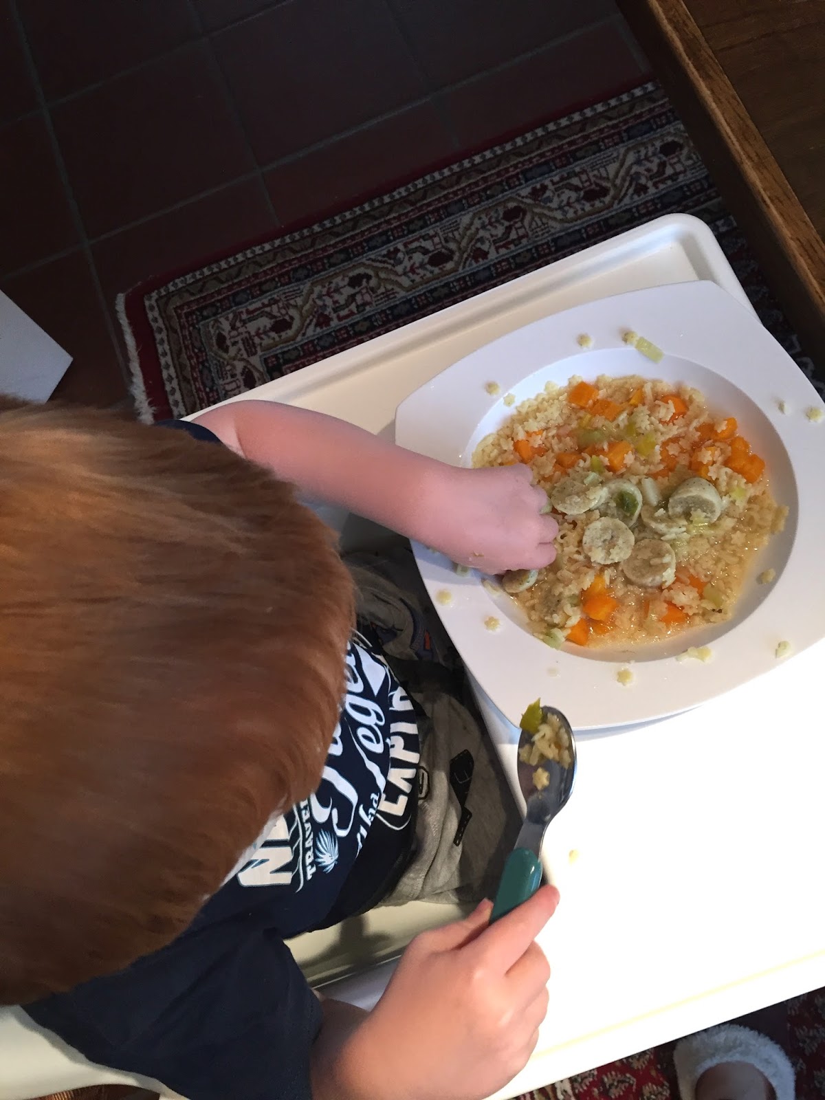 Zum Mittagessen gibt es im Heimaturlaub eine leckere Hühnersuppe mit Nudeln und Markklößchen, die allerdings alle vom kleinen Jungen gefuttert werden: