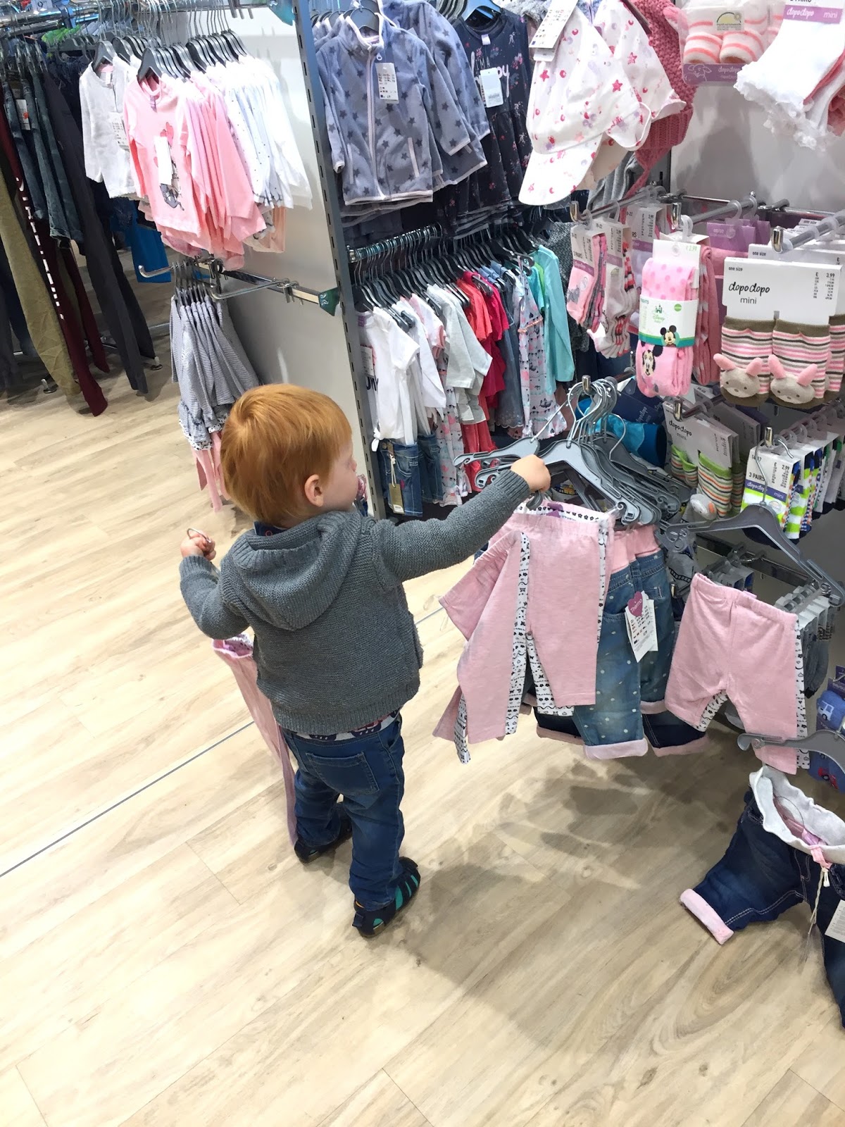 Dann bummeln wir ein wenig durch die örtlichen Geschäfte und räumen kurzerhand die ganzen Ständer um: Da links unten, wo jetzt die Stange leer ist, da gehörten die Hosen ursprünglich mal hin. Über die neue Platzierung wird sich die Verkäuferin sicher sehr freuen. Das Deko- Gen hat er eindeutig von Mama!