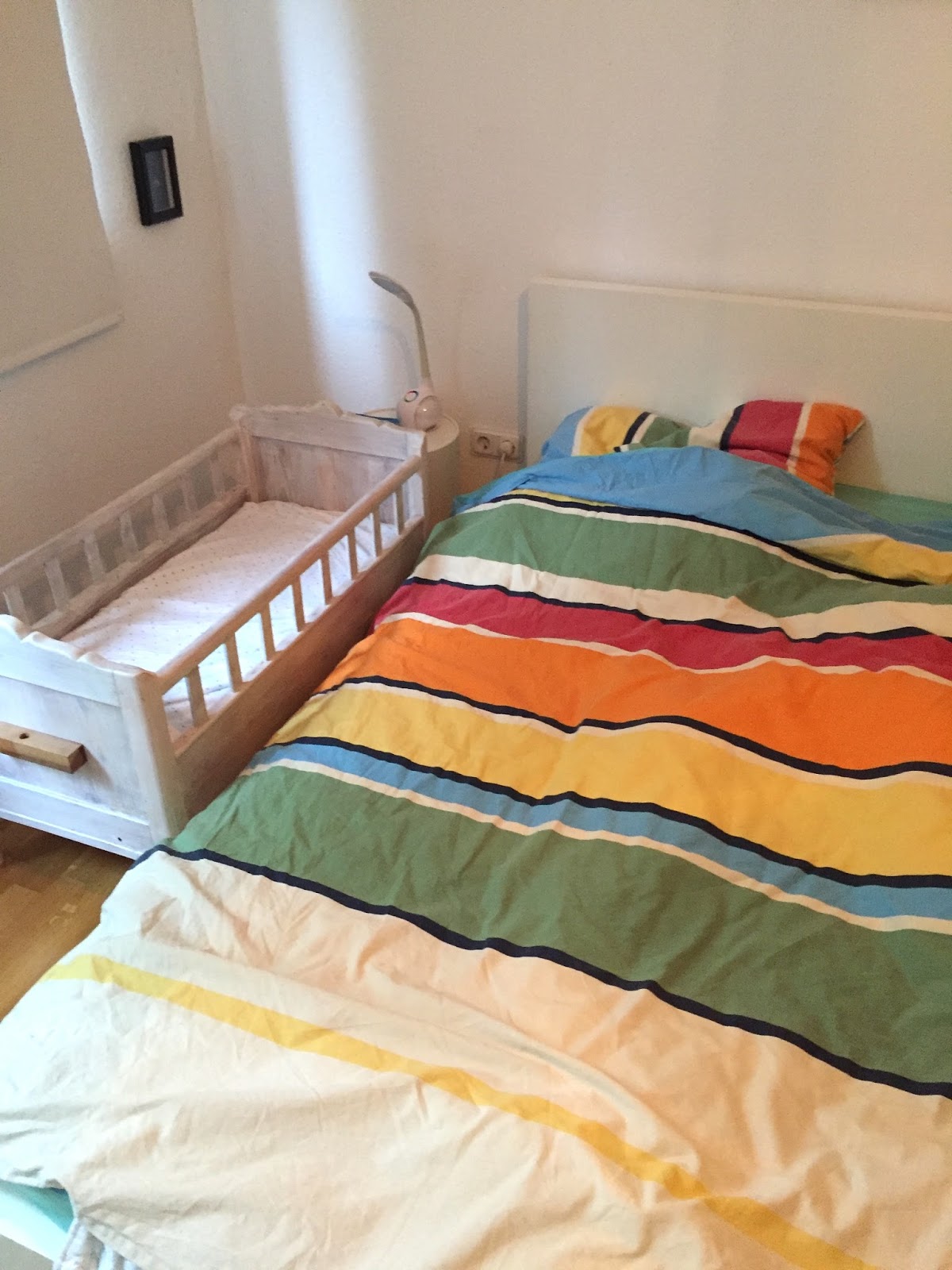 Außerdem ziehen wir feierlich ein Spannbetttuch aufs Babybettchen. Endlich wird da wieder jemand drin liegen: