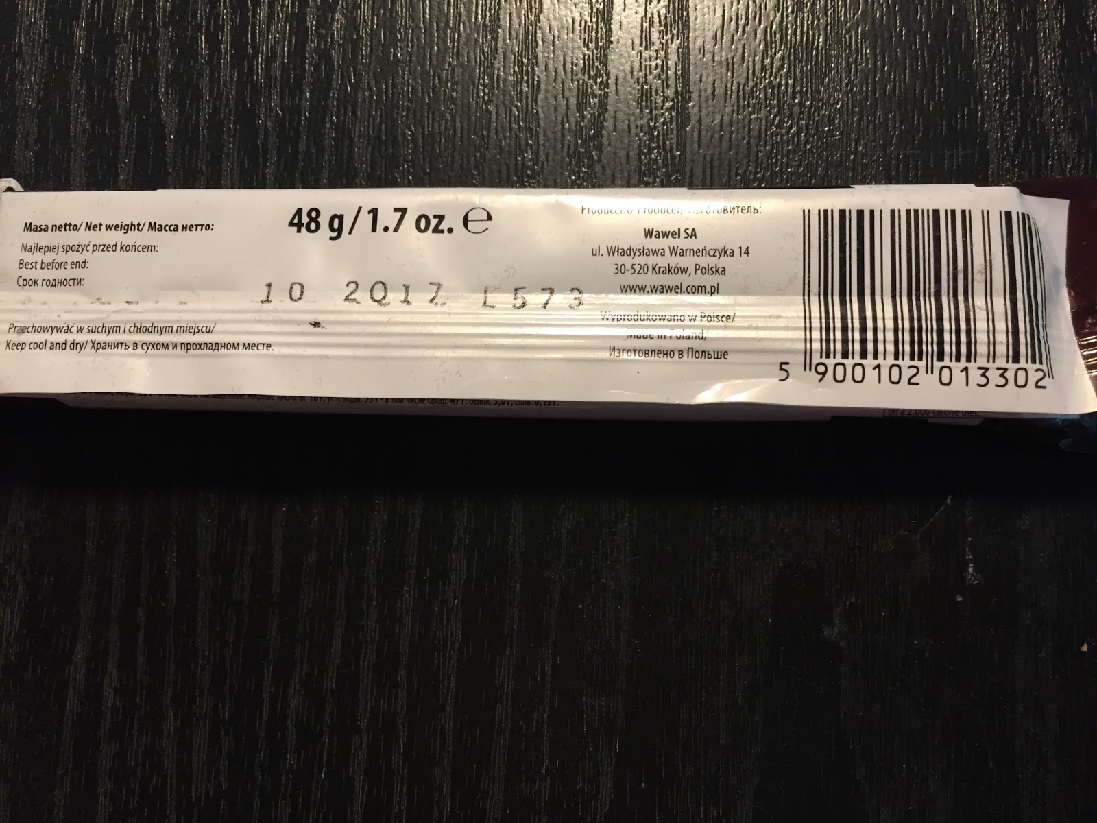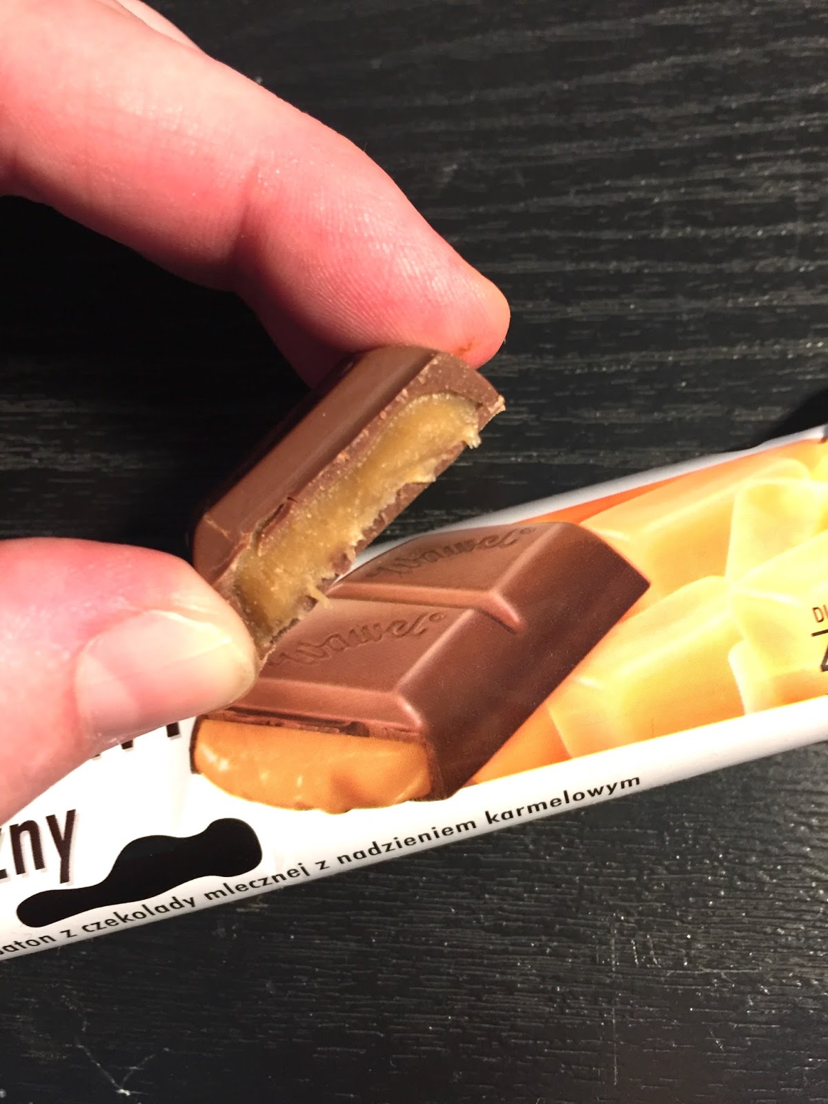 Auf der Verpackung, die bis auf die Aussagen „milk chocolate bar with caramel filling“ und „keep cool and dry“ komplett auf polnisch gehalten wurde, lässt sich entnehmen, dass der Riegel aus Krakau stammt und ein Nettogewicht von 48 g hat. Ansonsten sind nichtmal Inhaltsstoffe drauf gedruckt. Ist das nicht eigentlich EU- weit Pflicht?