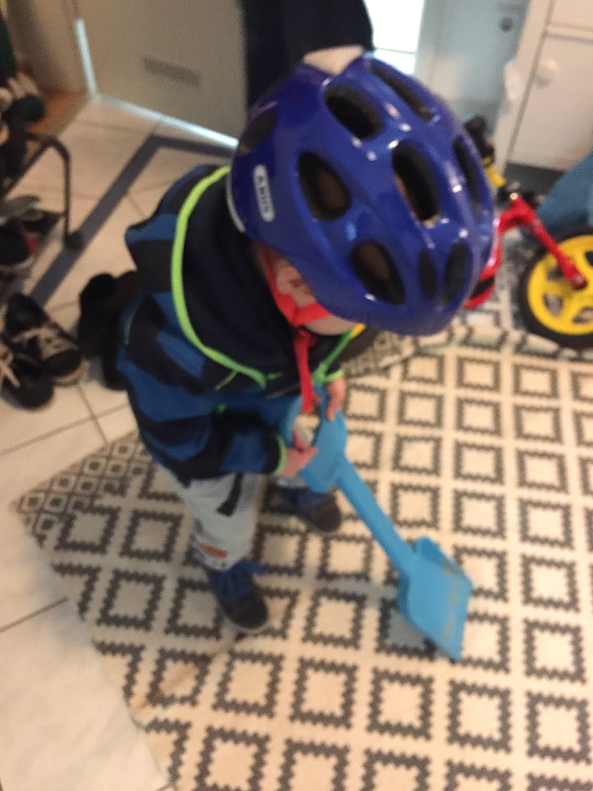 Zuhause kommt der große Junge von der Tagesmutter und zeigt voller Stolz seinen neuen Fahrradhelm, den der Opa ihm gekauft hat. Leider weigert er sich ihn für euch vorzeigbar zur Probe zu tragen und somit ist das Bild hier leider sehr verwackelt (und ein neues lehnt er ab, denn er möchte endlich raus, um mit dem Laufrad zum Spielplatz zu fahren):