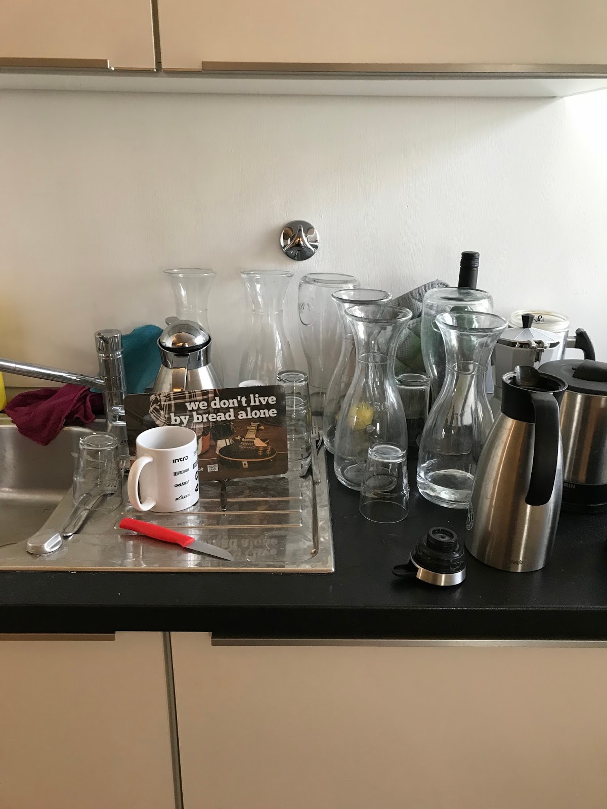 Der Mensch lebt nicht vom Brot allein“ ist auch auf englisch ein Sprichwort. Und hier künstlerisch wertvoll in ein Büro- Küchen- Stilleben eingebettet: