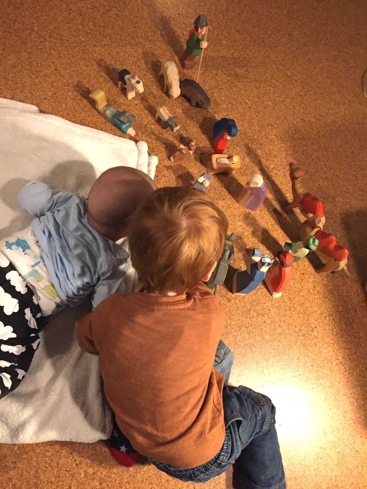 Endich zuhause spielen wir mit der jährlich wachsenden Ostheimer- Weihnachtskrippe. Dabei möchte Kind 1, dass Jesus gestillt wird, denn er sei sehr hungrig und hält ihn mir hin, damit ich das übernehme. Das Baby- Thema beschäftigt ihn gerade sehr…