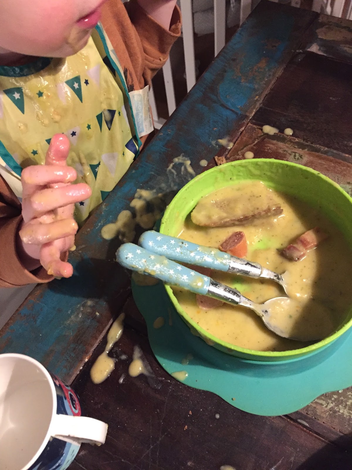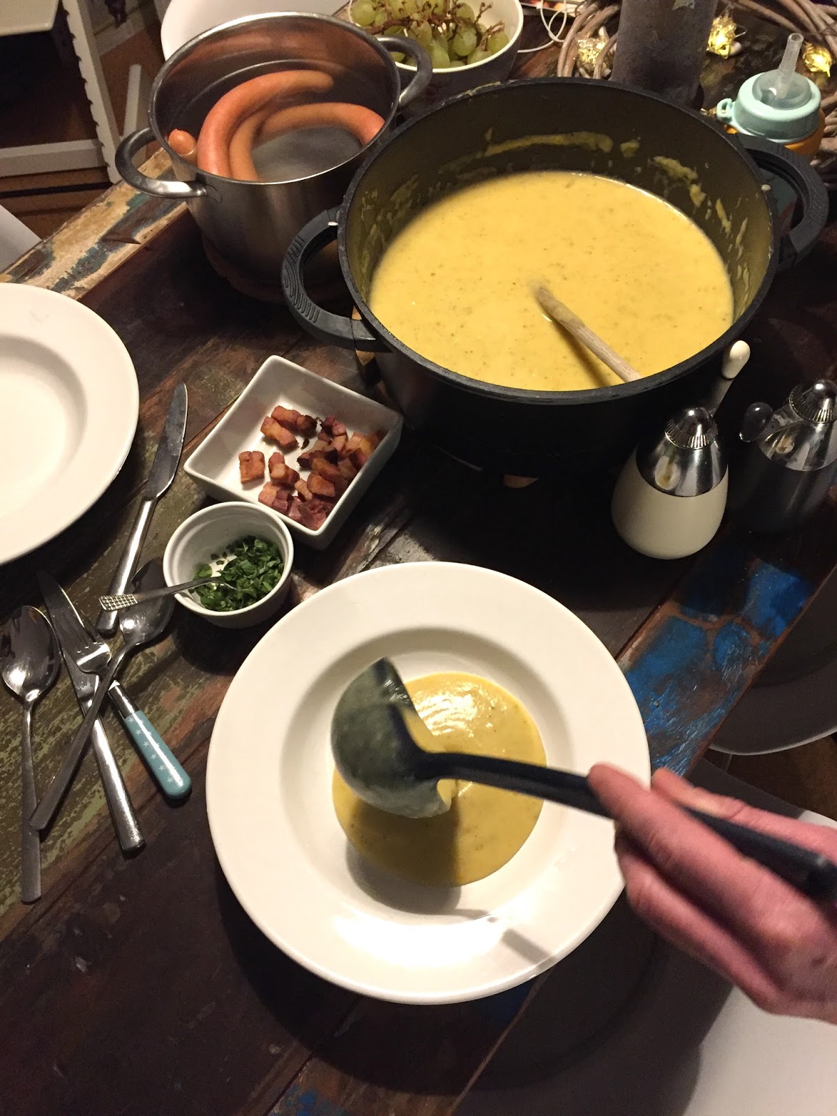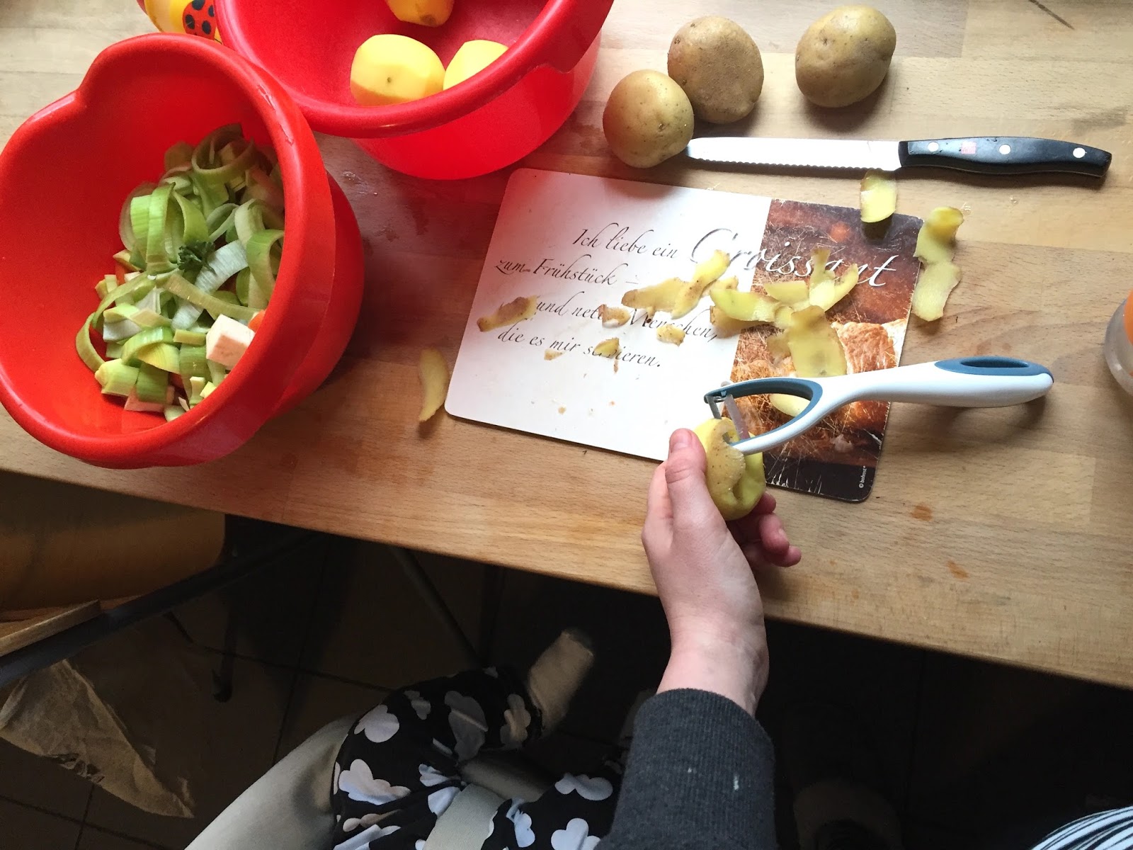 Heute Abend soll es eine cremige Kartoffelsuppe mit Würstchen geben. Dabei habe ich „tatkräftige“ Unterstützung von Kind 2, welches genau aufpasst, was ich da so vor mich hin köchele (und welches sehr besorgt guckt und mir sicher bald den Kochlöffel abnehmen wird).