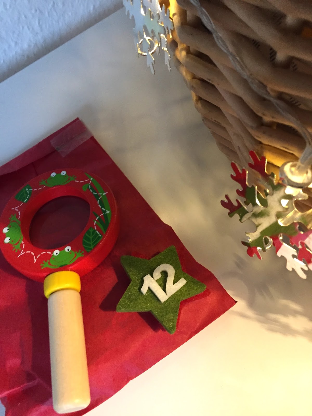 Als erstes wird natürlich der Adventskalender geöffnet. Darin befindet sich heute eine kleine Holzlupe, mit der sofort der nächtliche Naseninhalt des Augustjungen näher betrachtet wird. Bäh! Na klar, es gibt auch ein Stückchen Schokolade: Die ist aber nicht mehr auf dem Bild, weil sie schon längst gefrühstückt wurde.